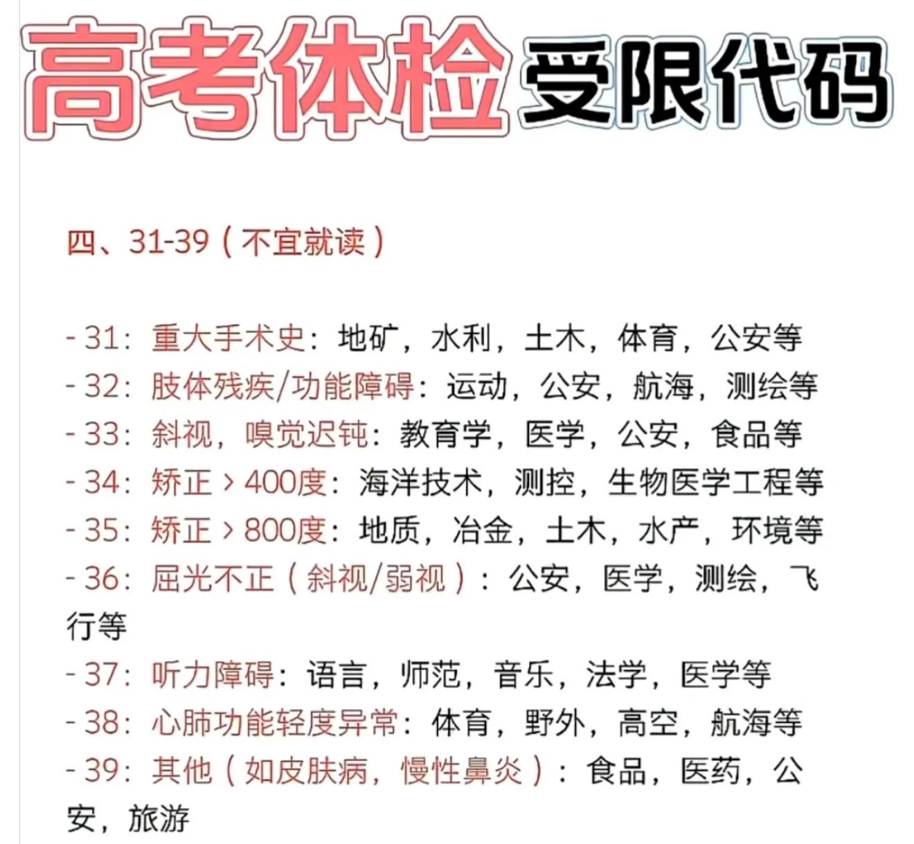 这类代码高校不会直接拒绝予以录取,然而在专业选择方面得格外慎重小心。比如说有做过重大手术的孩子,像地质、土木、公安类这类 require 高体能消耗的专业就并不适宜。要是高度近视超过 800 度的,测绘、航海、野外作业类专业最好尽量避开。