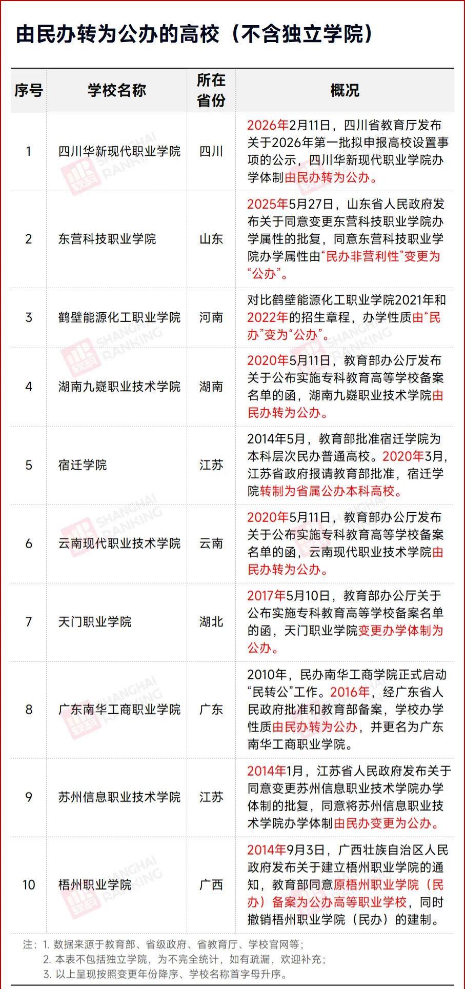 在过去十多年间,有10所民办普通高校成功转为公办,它们分布于多个省份,其中江苏有2所。这些转制绝非偶然,常常有着特定背景与条件。以四川华新现代职业学院来说,该校地处成都主城区,2007年就被四川开放大学全面接办,形成国资主导办学背景,为后续转公打下基础。2026年2月,四川省教育厅发布公示,拟把该校办学体制由民办转为公办,预计年内完成转公工作。
