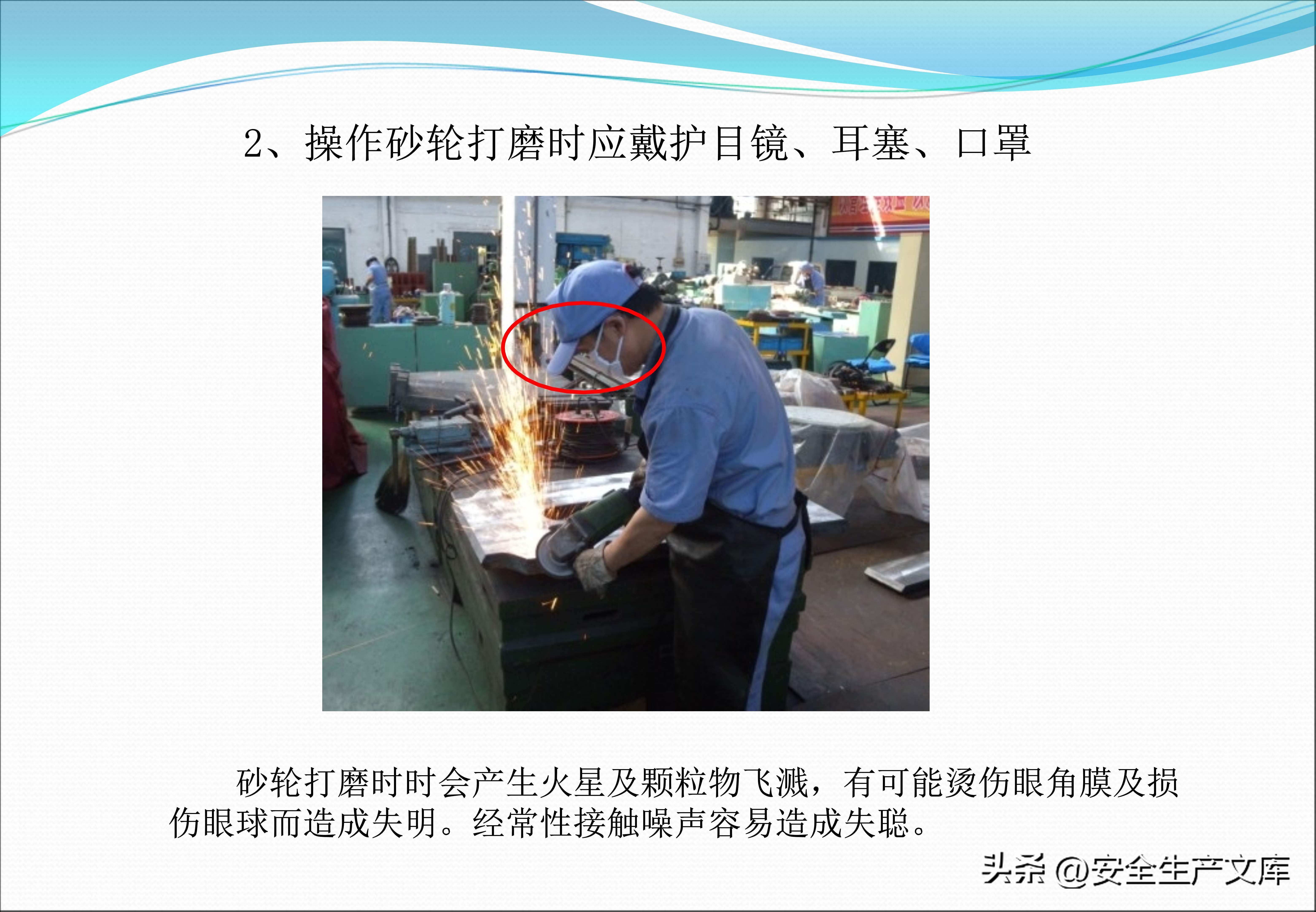 旋转机床的操控安全存在着严格的规定,课件借助对比图呈现出正确与错误的做法。在错误的示范当中,工人操作车床时戴着手套,手套的边缘已然被切屑缠绕;而正确的示范表明操作者双手是干净的,袖口扎得很紧,与旋转的部位维持着安全的距离。砂轮作业必须要同时佩戴护目镜、耳塞以及防尘口罩,图例里展现出飞溅的火花和粉尘对眼睛、耳朵、肺部造成的三重伤害。