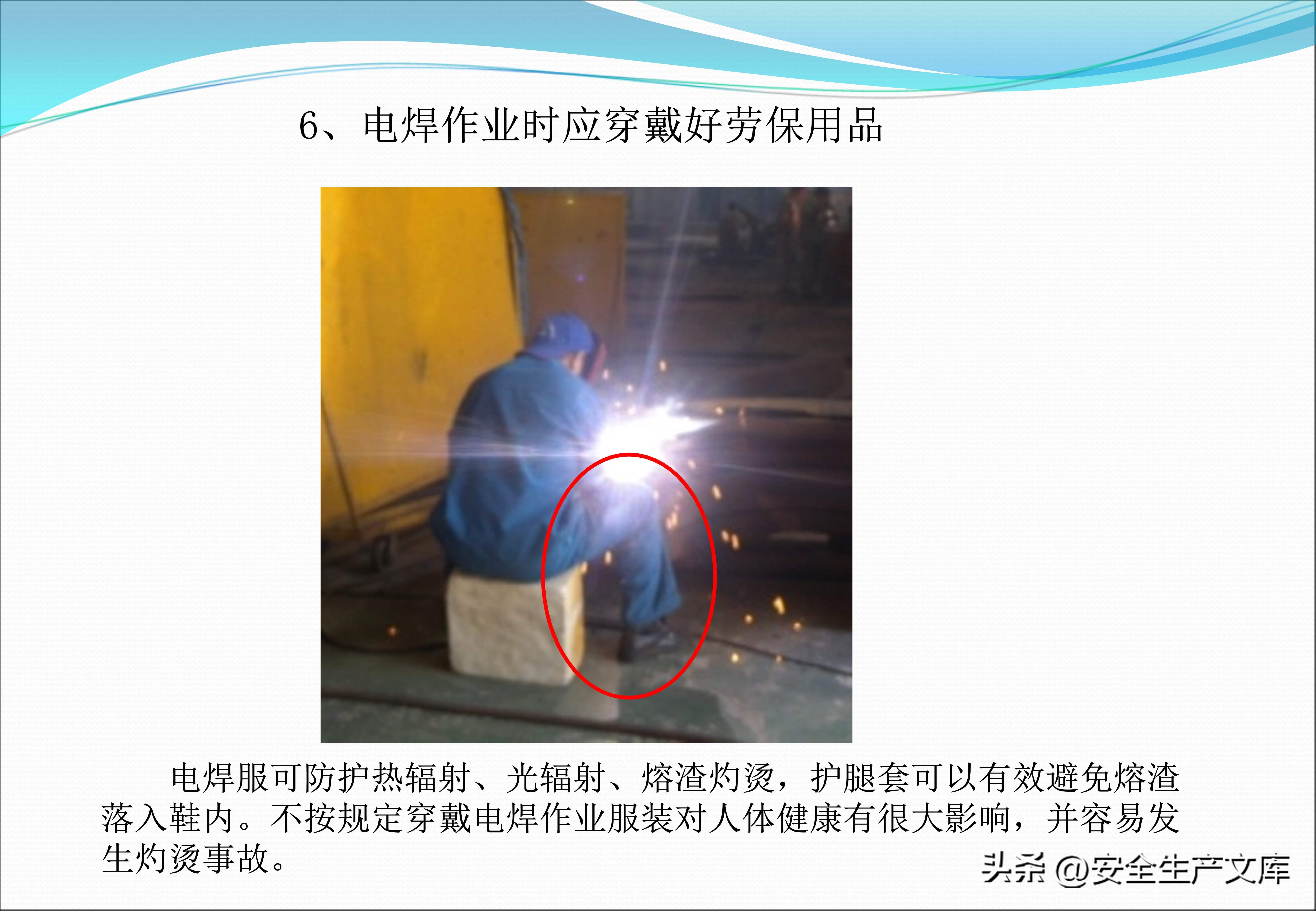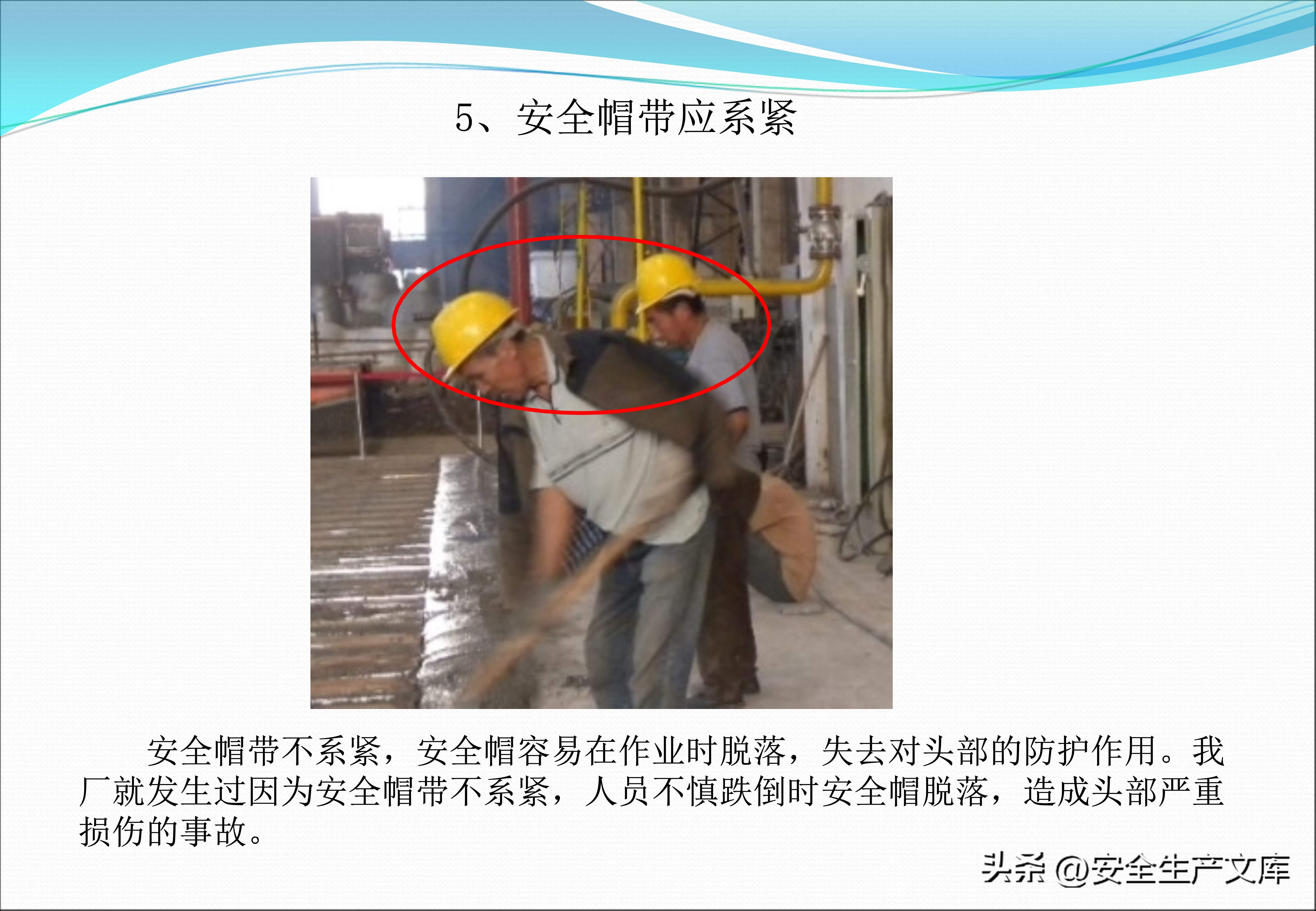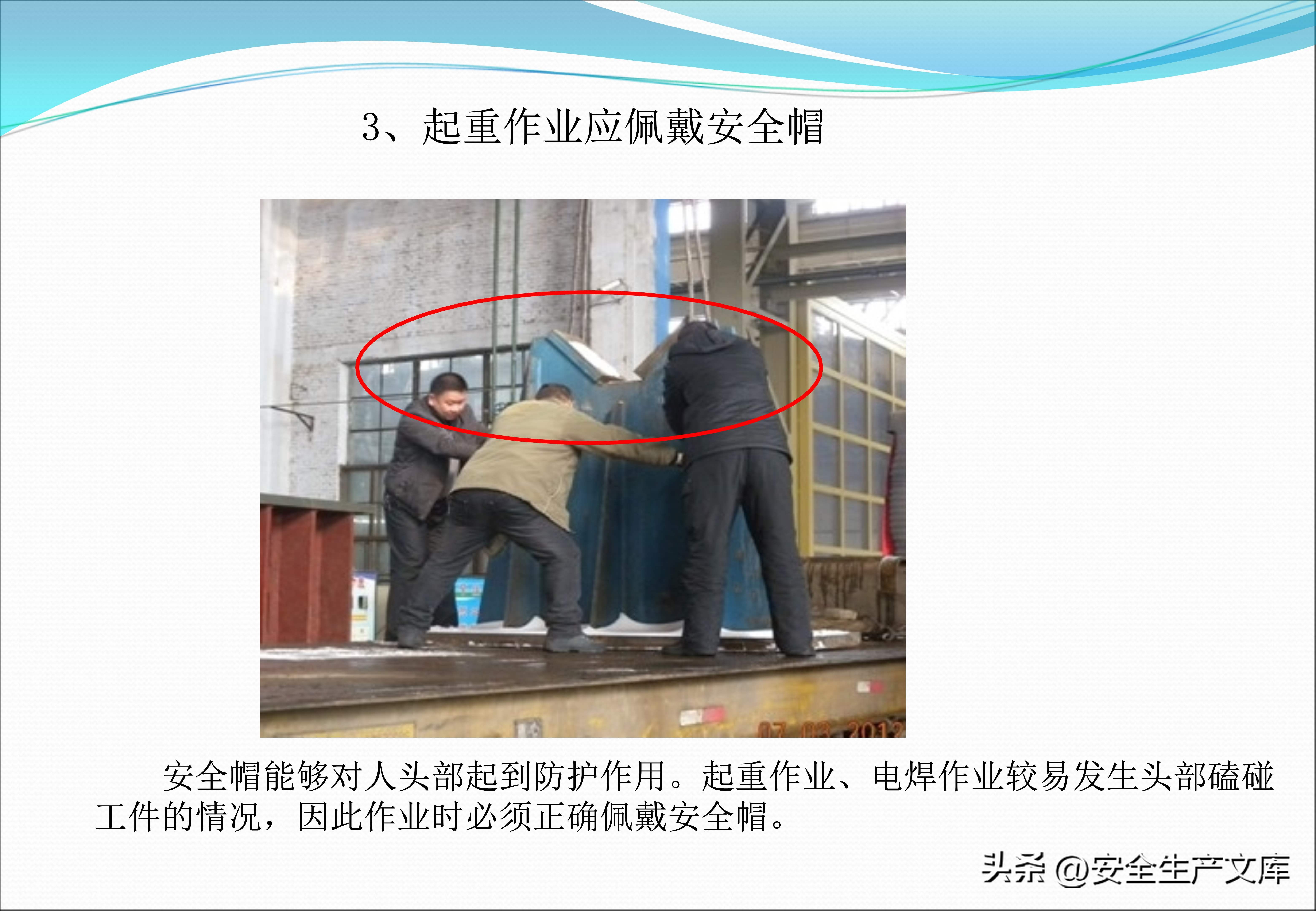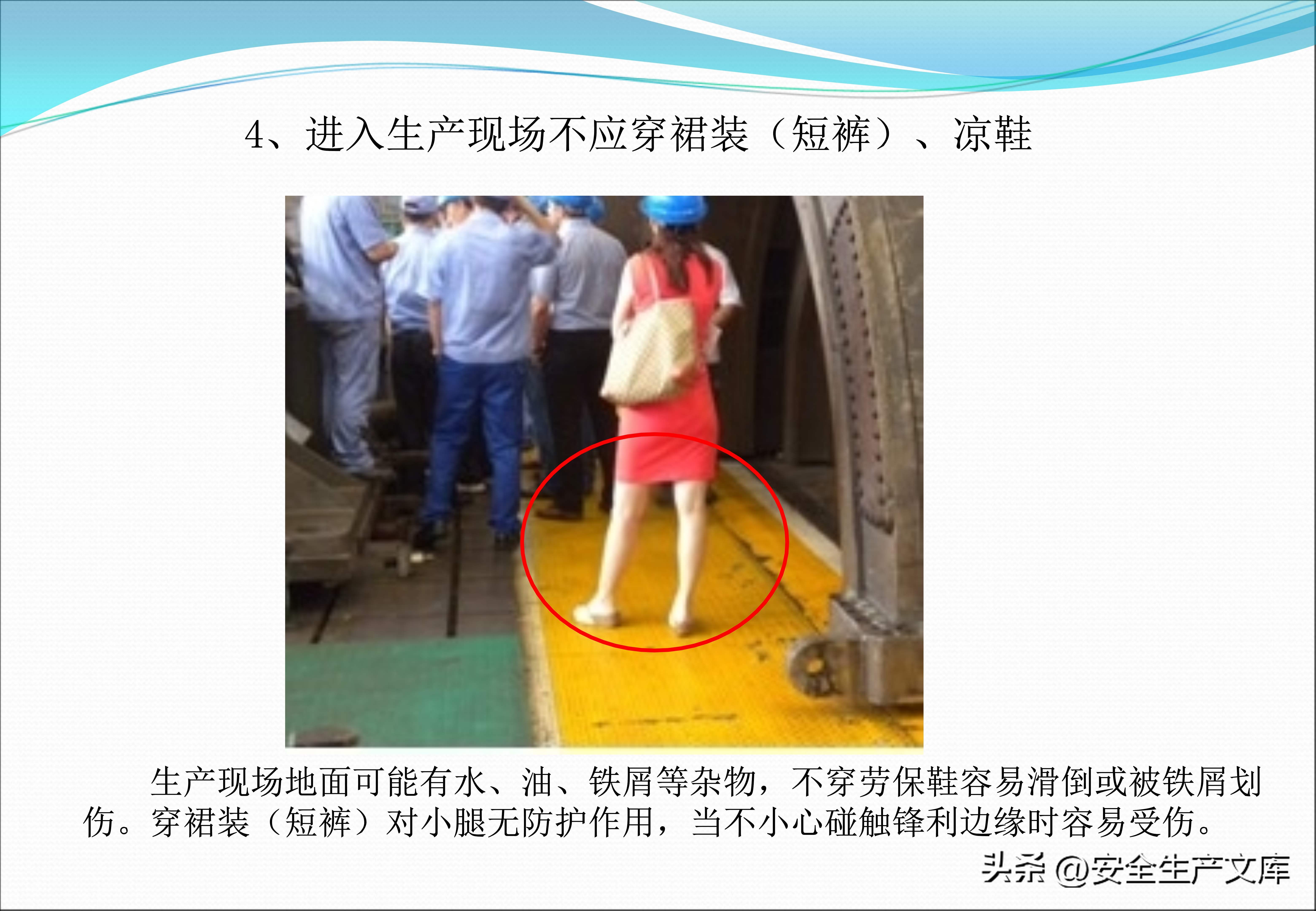 起重以及电焊作业的防护要求更为高些,课件图例当中,电焊工正确地佩戴了深色的护目镜、阻燃的工作服以及焊接手套,然而错误示范里面工人仅仅戴了普通的墨镜,衣服上面还有烧穿的洞眼。生产现场禁止穿着裙装、凉鞋,图例显示有一位女工穿着凉鞋进入车间之时,脚背被掉落的工件砸伤了。安全帽带必须系紧,图例对比展示了系与不系这两种情形下,帽子被撞击之后的不同结果。