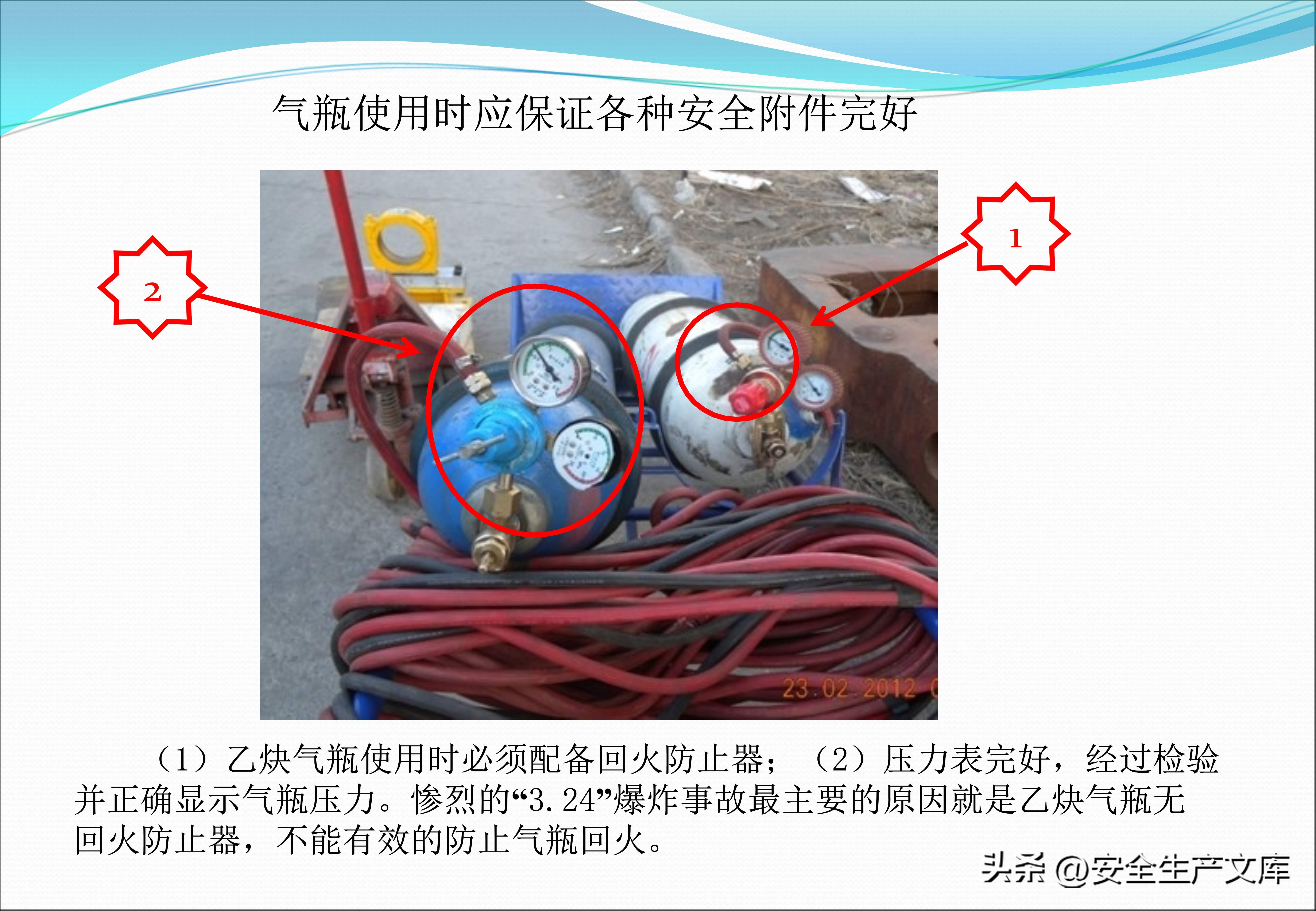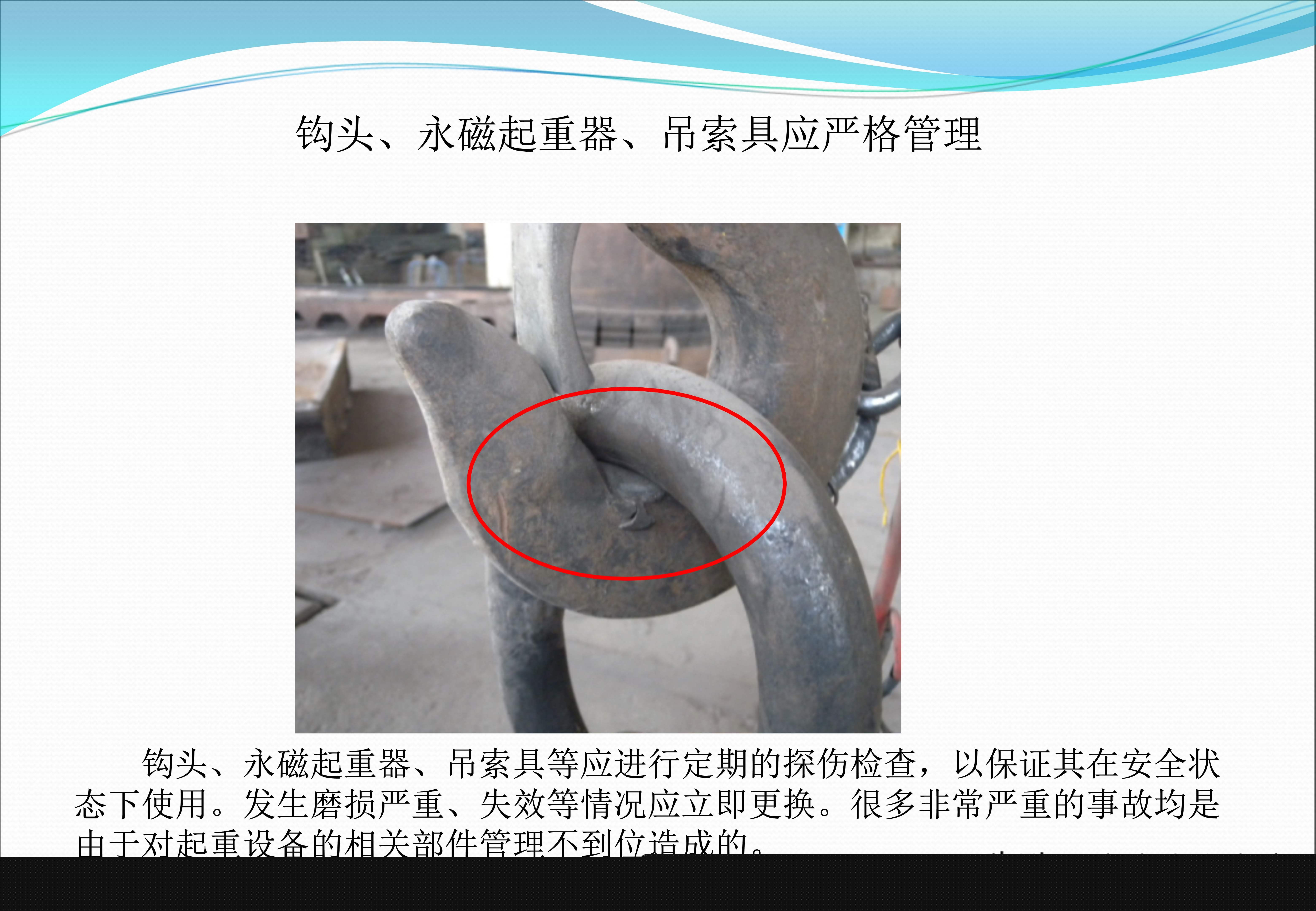 生产安全直接关联着设备设施的规范使用,课件中的图例呈现出,起重索具由于长期未曾进行探伤检查,其中的卸扣已然出现显著裂纹,随时存在断裂的可能性,图例里一个未安装回火防止器的乙炔瓶,在回火情形出现时直接引发爆炸,而乙炔瓶配备回火防止器属于气瓶管理的重点内容,设备传动装置的防护罩务必保持完好,图例中的工人手指因防护罩被拆除后未恢复,被卷入了裸露的齿轮。