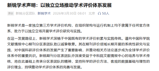 新锐学术于3月30日发出声明,再度着重表明自身独立第三方身份,声明内称,此机构于组织架构以及运行机制方面,都并非归属于任何官方体系,且致力于凭借独立立场去开展学术评价研究,简言之,它并非中科院体系里的机构,而是一个独立的评价平台。