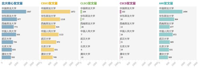 只看核心期刊的话,排名出现可有意思的变化了。核心期刊是发表高质量论文、代表学科前沿的期刊,有北大核心、CSSCI、CSCD、CLSCI和AMI这五大体系。按这个标准衡量,中国政法大学仍以2069篇位居榜首。