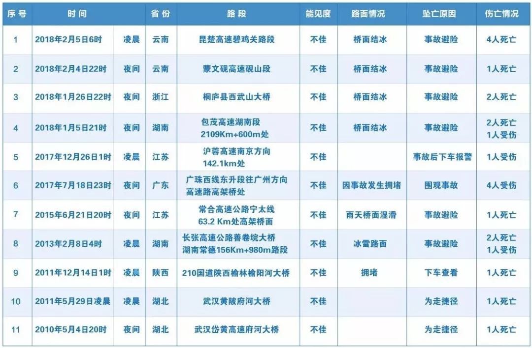 在2018年2月5日的凌晨时分,具体是6点的时候,于云南昆楚高速18公里处的桥梁路段那边发生了一起相当悲惨的事件,当时路面出现结冰的状况,进而致使53辆车接连发生连环相撞,就事故本身而言并没有造成人员死亡这个情况,然而有4名驾乘人员在进行那种紧急避险的时候,从桥梁中央分隔带的间隙处坠落进而失去生命,在一个月之内,云南、湖南、浙江这几个地方连续发生了4起类似的事故,总共造成了9人死亡。