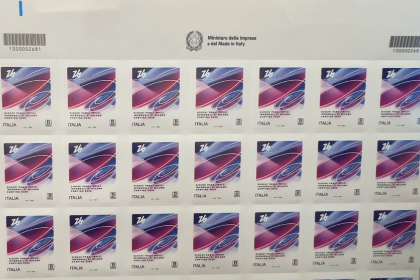 在邮票的左上角位置,2026年米兰冬奥会的官方会徽“Futura”静静地占据着一块之地。那个由一笔所画出的“26”数字,自身就传达着“未来属于每个人的胜利”的观念。设计师并未对它进行刻意地突出,而是使其成为抽象画面当中的一部分。