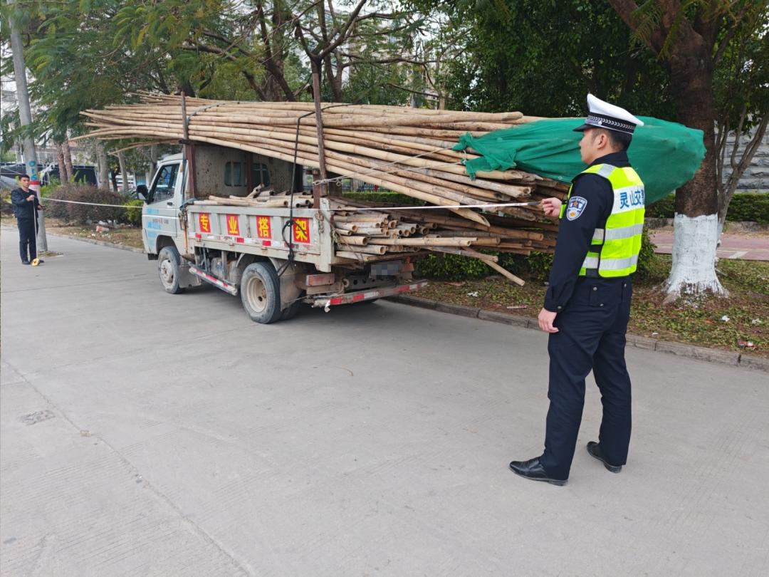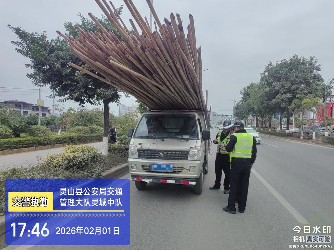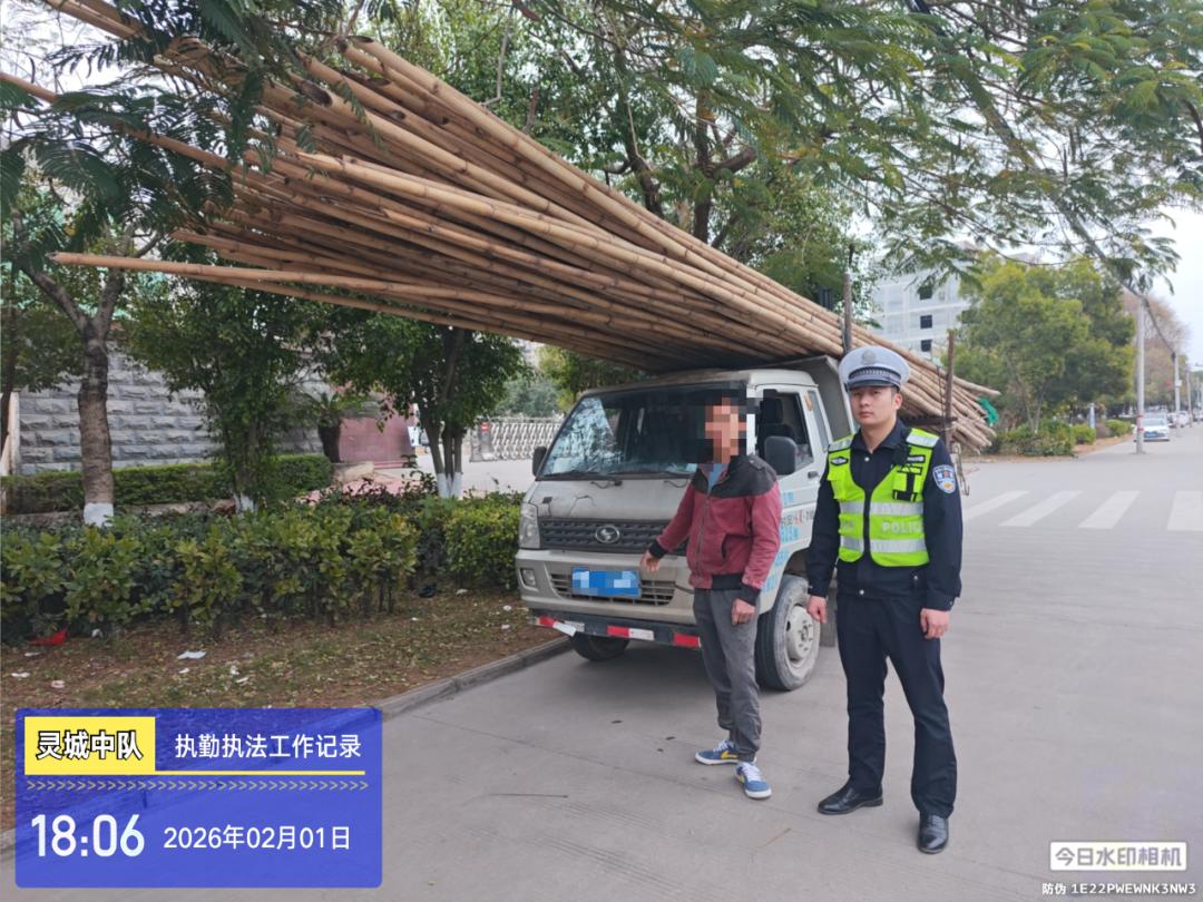 一场超长距离运输,其背后隐匿着多少关乎人命的风险呀,2026年2月1日,灵山县有一名司机,拉着9.7米长的竹子驶上马路,然而他所驾驶的货车车身长度仅仅只有4.4米,这一被交警当场查获的违法行为,再度将货运行业里那些被人忽视的安全口子给撕开了。