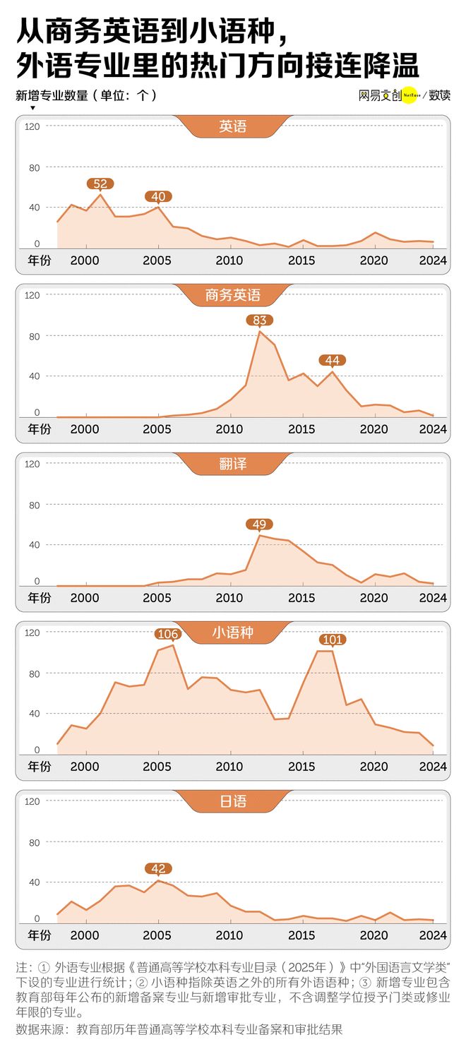 “一带一路”倡议带来第二波影响,中国企业与项目纷纷大步迈向海外,然而却发觉精通当地语言的人才极为稀罕。高校听闻此情况后迅速行动,在2016年至2017年期间,小语种专业连续两年新增了101个,这一数量占据当年外语新增专业的六成以上。可是风口来得迅猛消逝得也迅速,从2018年开始小语种新增数量大幅减少,直至2024年仅仅剩下9个。