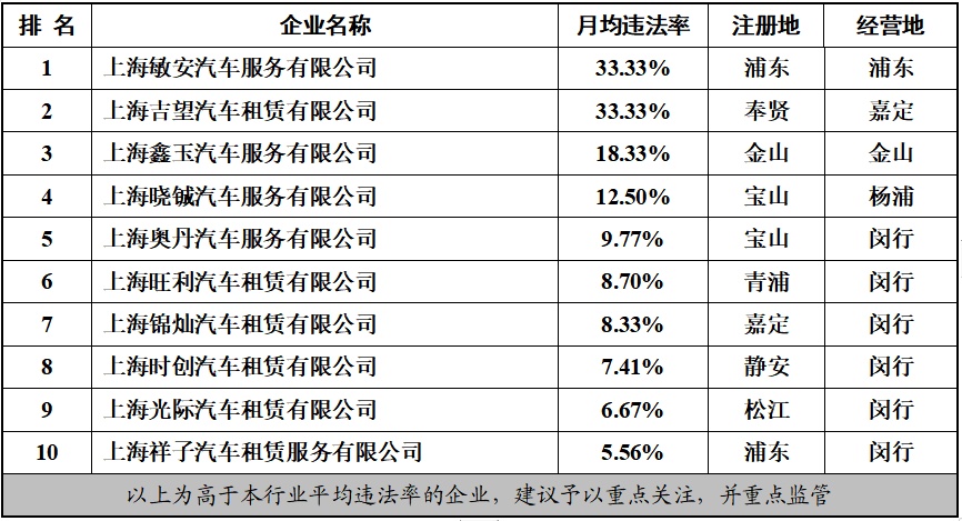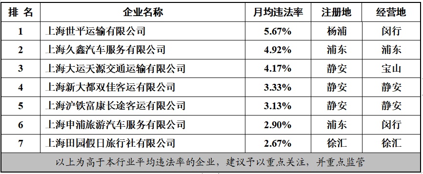 市里面包车客运企业的数据,那可真是特别触目惊心,行业平均违法率竟然高达4.64%。上海敏安汽车服务有限公司,跟上海吉望汽车租赁有限公司并列处于第一位,它们的违法率都是33.33%,这所代表的意义就是,这些企业每三辆车之中就有一辆在一季度的时候有过违法行为。上海鑫玉汽车服务有限公司以18.33%的违法率排在了第三位。