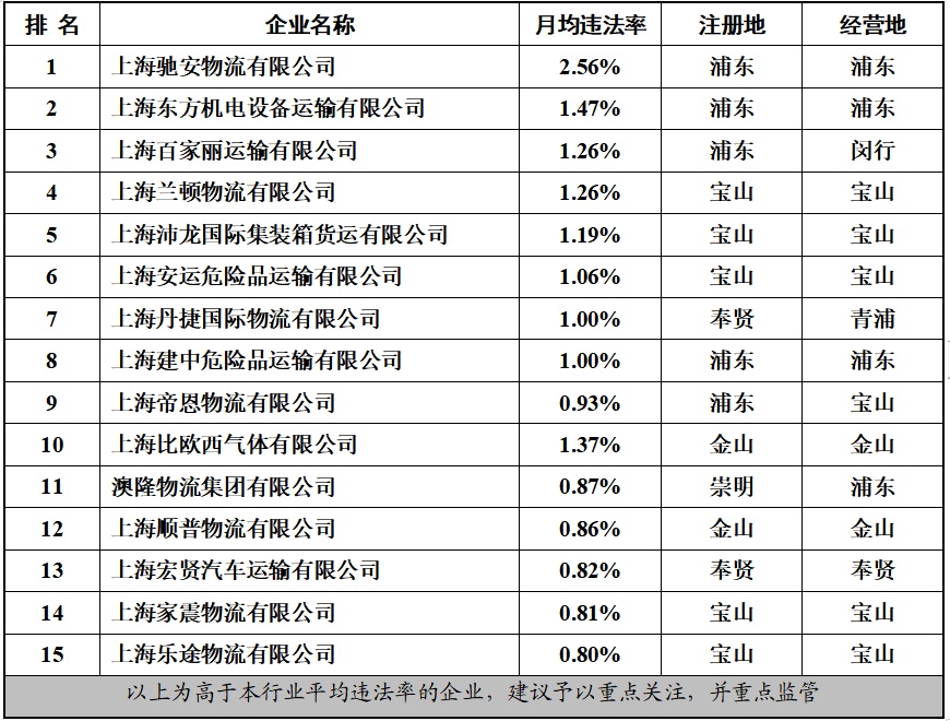 道路危险货物运输这个行业之中,那些车辆数量超过50辆的大型企业呈现出的表现相对而言是比较好的,季度月均违法率仅仅只有0.76%。上海驰安物流有限公司以2.56%的比例排在了首位,上海东方机电设备运输有限公司以及上海百家丽运输有限公司分别是以1.47%和1.26%的比例位列第二和第三。