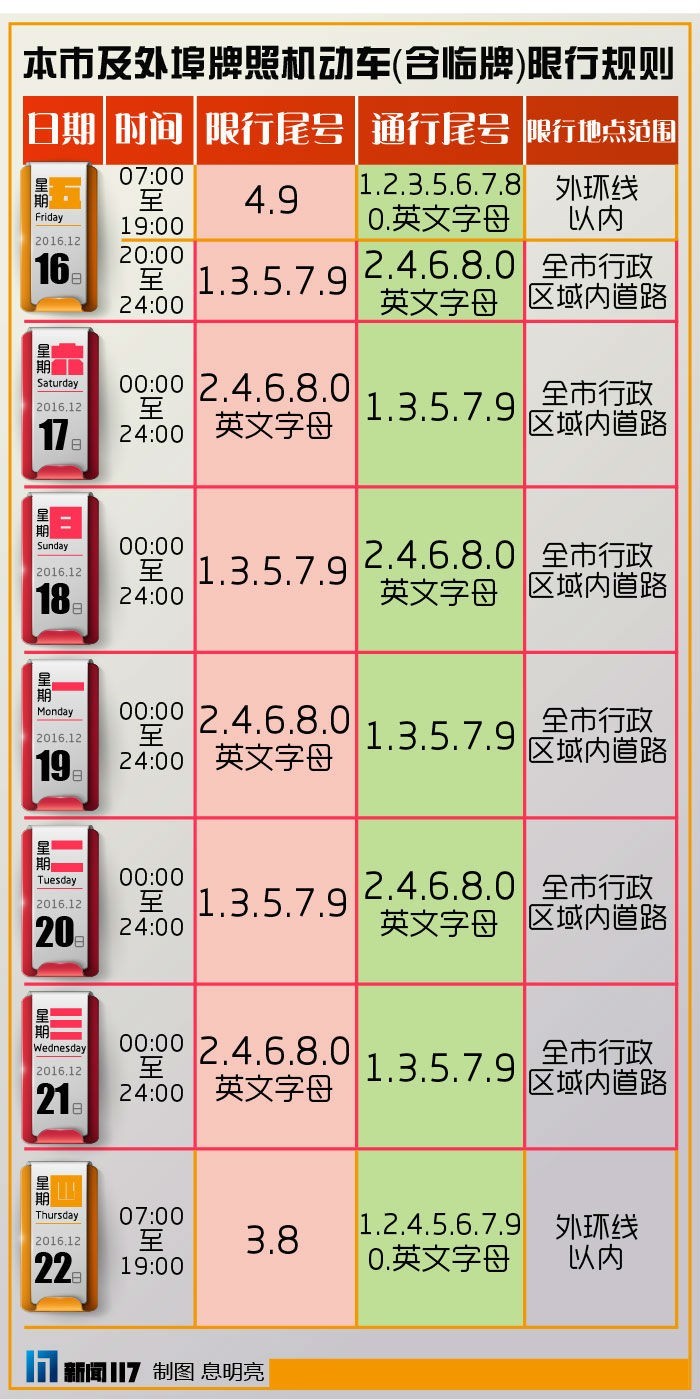 16日,此日情形颇为特别,白日时段,自7点至19点,依旧依照平常的尾号轮换限行规则,限行尾号为4和9;待至晚间20点过后,便切换成单双号的行车模式,当晚限行尾号是1、3、5、7、9;这意味着倘若你所驾驶的乃双号车辆,那么晚上8点之后方可外出。