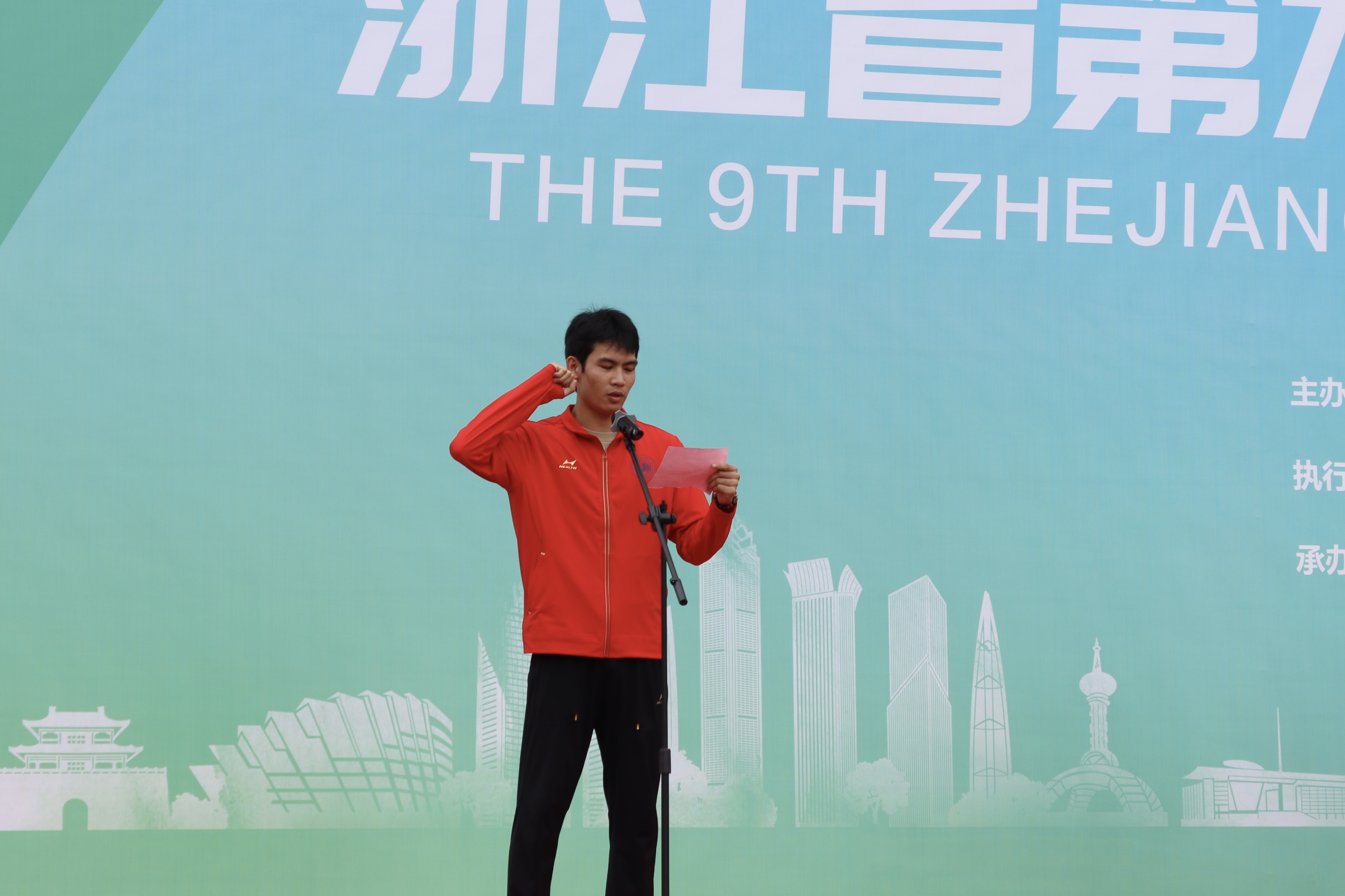 在全体人员的目光注视之下,温州大学的运动员代表林泽坚缓缓地向前走去,他的右手紧握成拳,神情庄重地宣誓会遵守相应规则、尊重比赛对手,并且会带着饱满的热情去赛出自身风格。而裁判员代表翁士洋同样郑重地作出承诺,会尽到自己的职责,保证比赛的判罚公正且准确无误。
