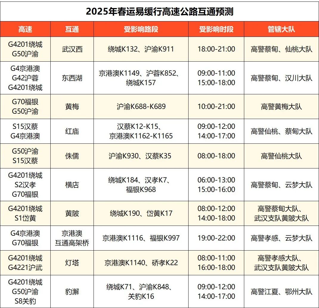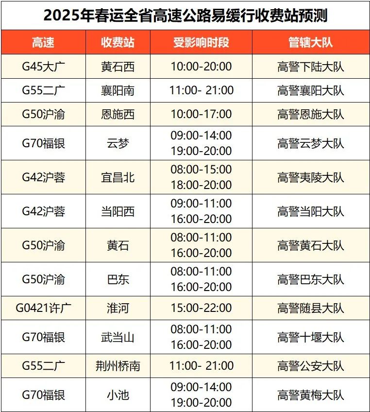 尤其是环绕武汉市周边的路段,还有连接省内重要城市的主要通道,如同沪渝高速、福银高速、京港澳高速湖北段这类,部分路段通行时压力极大。在此建议您事前查看导航,错开高峰出行,像是选择在清晨8点之前或者晚间22点之后出发。
