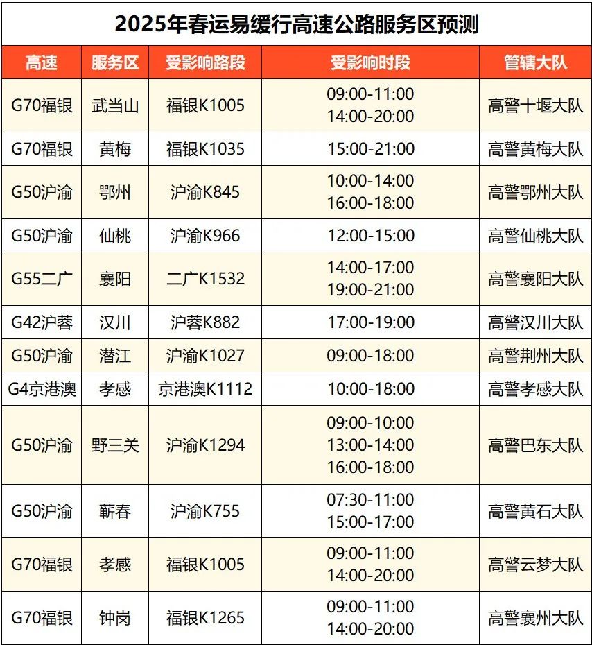 同时,诸如武当山、潜江、野三关这般的12个热门服务区,鉴于停车休息、加油充电需求呈现旺盛态势,故而也面临着较大的拥堵风险。当您快要接近这些区域的时候,请预先减速,留意观察路况,做到有序通行。