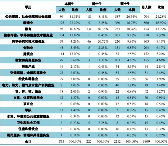 从各个学历层次去看,博士毕业生主要去向高等教育单位以及科研设计单位,占比为75.44%,而本科毕业生更多选择国有企业,占比68.66%,硕士毕业生更多选择其他企业,占比55.52%,呈现出清晰的学历层次就业方面的差异。