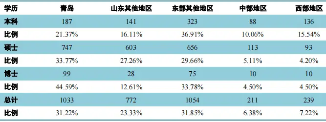 出去山东之外,京津沪粤以及东部的其他地方,同样身为重要的去向,本科毕业的学生前往这些地方的占比是34.97%。并且,选出去西部就业的本科毕业的学生,也占据了13.26%,地域的分布展现出以山东作为核心、向全国进行辐射的整体的格局。