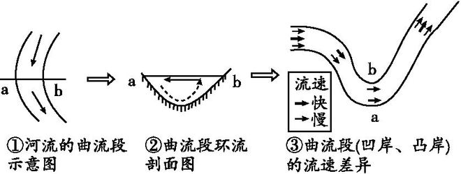 有凹岸侵蚀、凸岸堆积这现象的形成,重点是弯道处有横向环流。河水冲进弯道时,表层水流因离心力使它冲向凹岸,致使凹岸水位被抬高,比凸岸略高些。如此这般,底部水流在压力作用的情况,会从凹岸流向凸岸,构成一个完整的横向环流圈。