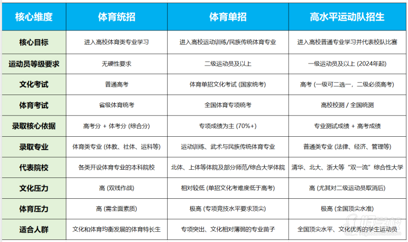 老观念“体育生只能走体育统招”别再困住人啦!现在升学通道可不是独木桥,体育统招一条路径呈现在面前。体育单招又一条路径清晰摆在眼前。高水平运动队也有条路径清晰展现。这三条路径清晰摆在当下,选对正确方向,甚至通过比以往更低分数能敲开名校大门。本文会为你把这三条赛道门道完全拆解开来,帮助你找到最契合自身的那一条路径。