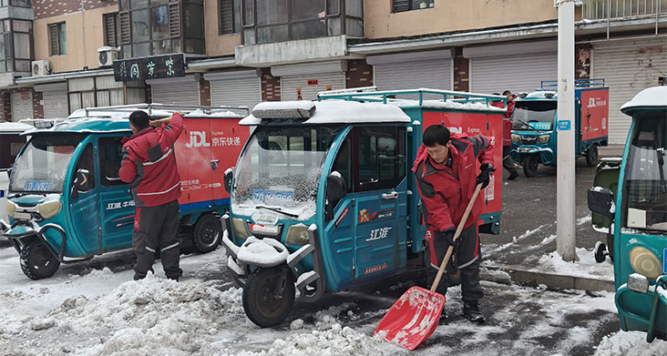 此处在安徽省合肥市,强降雪才刚降临之时,快递企业即刻就快速地组织了管理人员,还组织了一线员工,同时也组织了后勤保障人员,全体人员都投入到铲雪除冰的这场攻坚战之中。他们着重对分拨中心进出通道清扫,还对网点门前进行清扫,以及清扫周边主干道路,其目的在于竭尽全力保障每一辆快递车能够安全进出,并且保障快件能够正常中转。