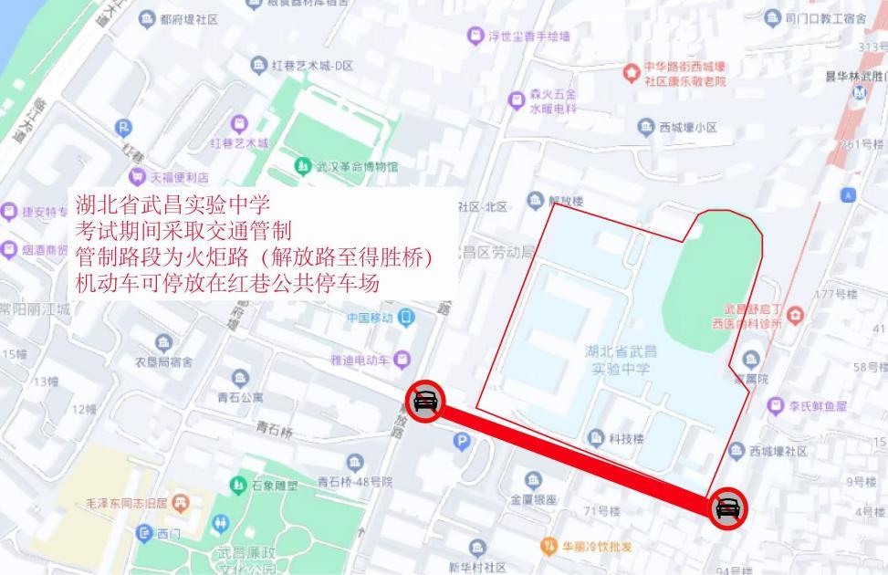 地处徐家棚街道团结路8号的湖北大学附属中学,于考试期间,团结路惠安路到红盛路、惠安路团结路到秦园路路段实施管理限制,红盛路进入团结路禁止往右边转弯。送考车辆能够在团结路管制区域之外以及惠安路按照单排顺着方向停放。搭乘地铁7号线在徐家棚站F出口下来,行走643米便可到达。