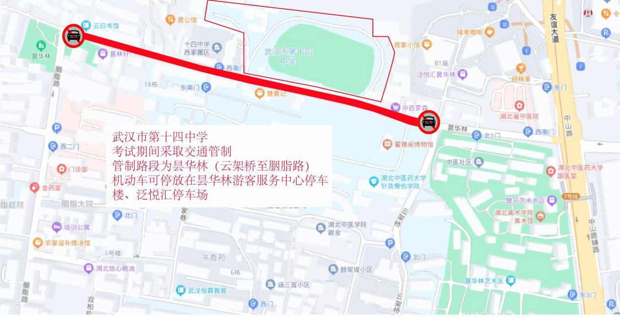 位于昙华林117号的武汉市第十四中学,在昙华林云架桥至胭脂路的这段道路会实施管制措施。那些来参加考试孩子的家长,可以选择把车停放于昙华林游客服务中心停车楼或者泛悦汇停车场。若选择乘坐地铁出行,乘坐的是2号线又或者7号线的时候,到达那螃蟹岬站后从E出口下车,然后穿过文艺小巷,步行590米就到了那个考点的位置,此地还是暖心故事发生的地方。