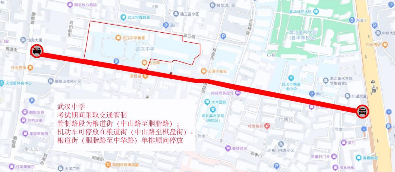 武汉中学所处位置是粮道街275号,于考试期间,粮道街从中山路至胭脂路的路段实施管理管制。送考的车辆要依照交警的引导,在粮道街棋盘街至中山路路口、粮道街胭脂路口至中华路口进行单排顺向的停放。建议乘坐地铁7号线,在小东门站A出口下车,再步行778米就能抵达考点。