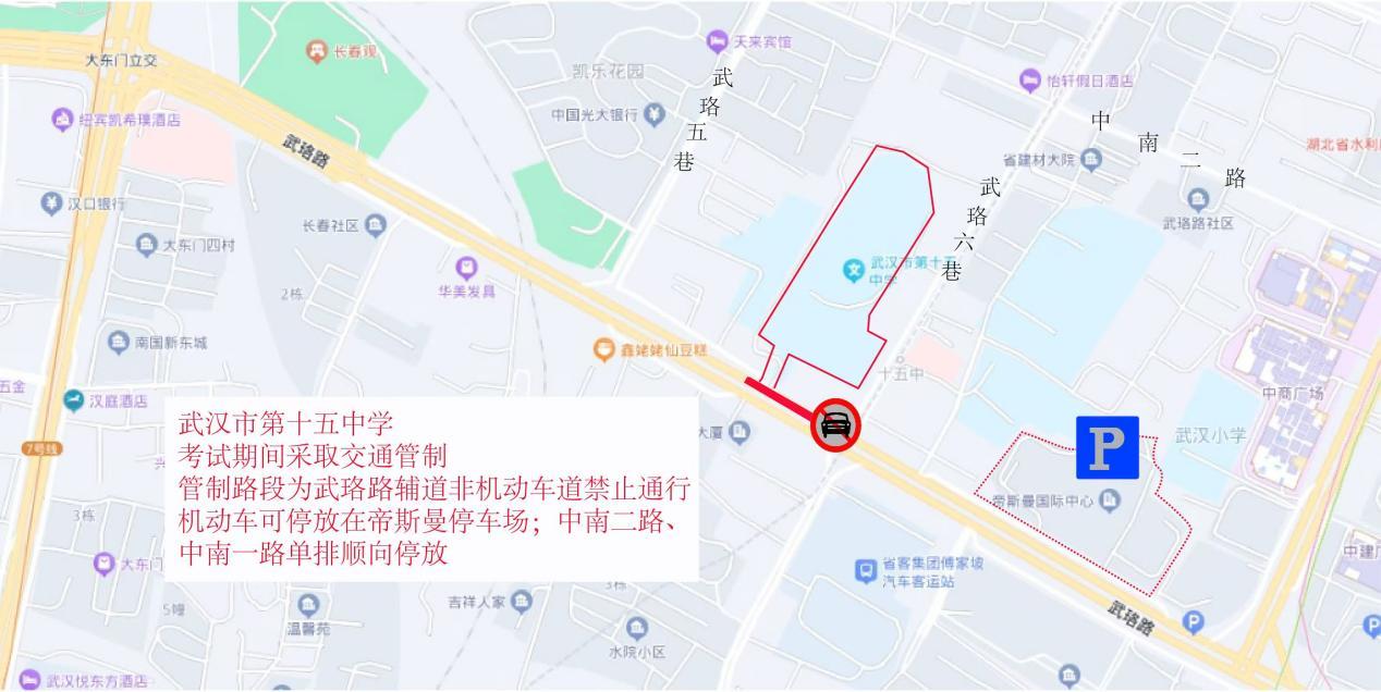武汉市第十五中学位于武珞路343号,其门前武珞路辅道的非机动车道禁止通行。送考车辆能够在帝斯曼、中南二路、中南一路单排按顺序停放,之后经由武珞路、武珞五巷或者六巷步行前往考点进入。最为便利的方式是搭乘地铁4号线,于中南路站B出口下车,接着步行大概795米,因处于核心商圈,所以请一定留出足够多的富余时间。