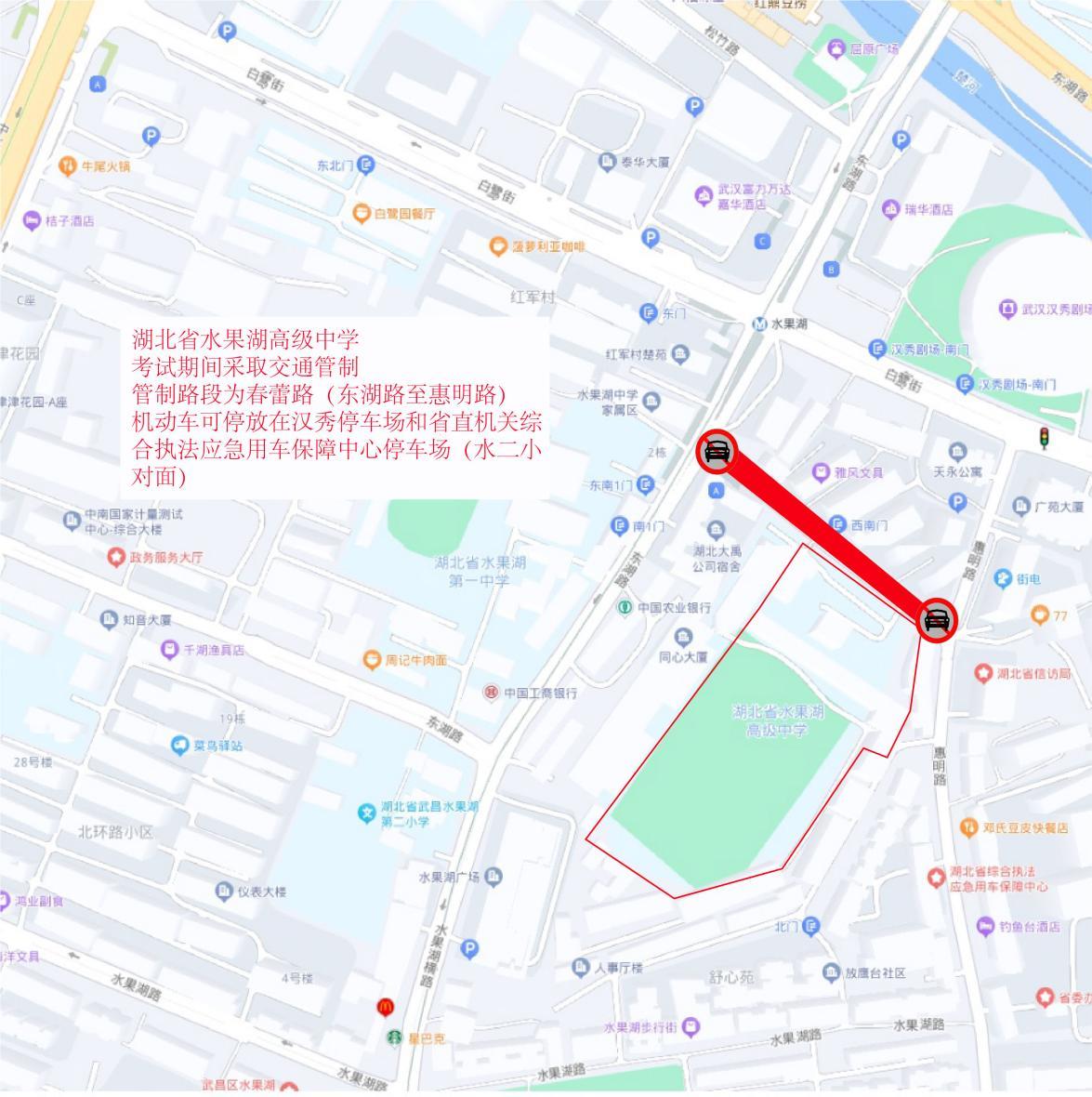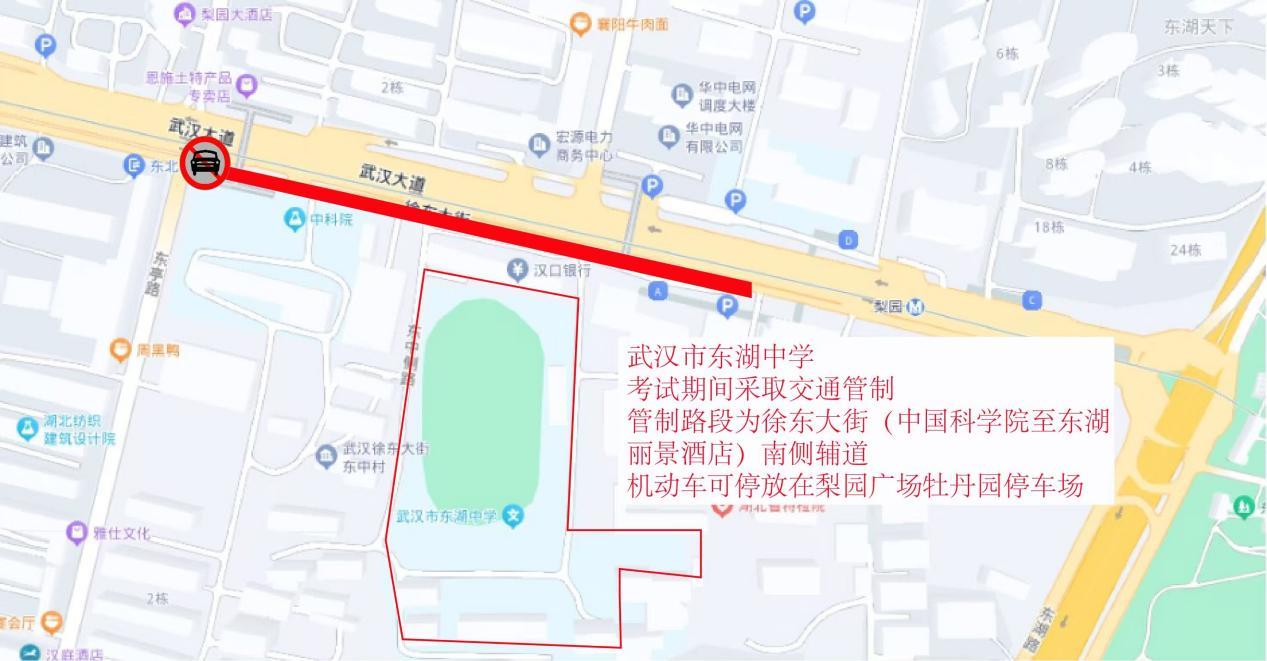 有着武汉市东湖中学如此校名的学校,其所处位置是在徐东大街348号,于考试这个特定期间,徐东大街南侧辅道之中,从有着中科院这样名称的地方到东湖丽景酒店所在路段将会实施管制举措。建议把车辆放置在梨园广场那边的停车场之处,并随即顺沿着徐东大街步行去往考点所在之地。要是选择乘坐地铁8号线可在梨园站A出口下车,仅需进行短途性的步行317米便能够达成抵达目的,这般情形是非常便捷的。