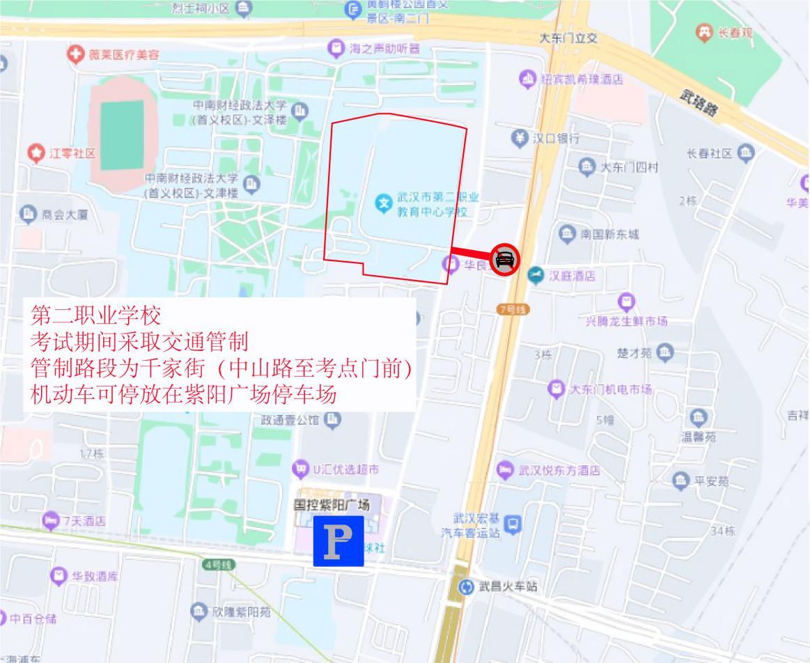 武汉第二职业教育中心的具体位置处于千家街4号,在考试期间的时候,千家街中山路往前往考点途经涉及的路段会实施管制措施。送考的车辆能够停放于紫阳广场停车场,之后通过步行的方式前往千家街。最为推荐采用的方式,是乘坐地铁4号线或者7号线,在武昌火车站G1出口下车,再步行大约900米便可成功抵达考点。
