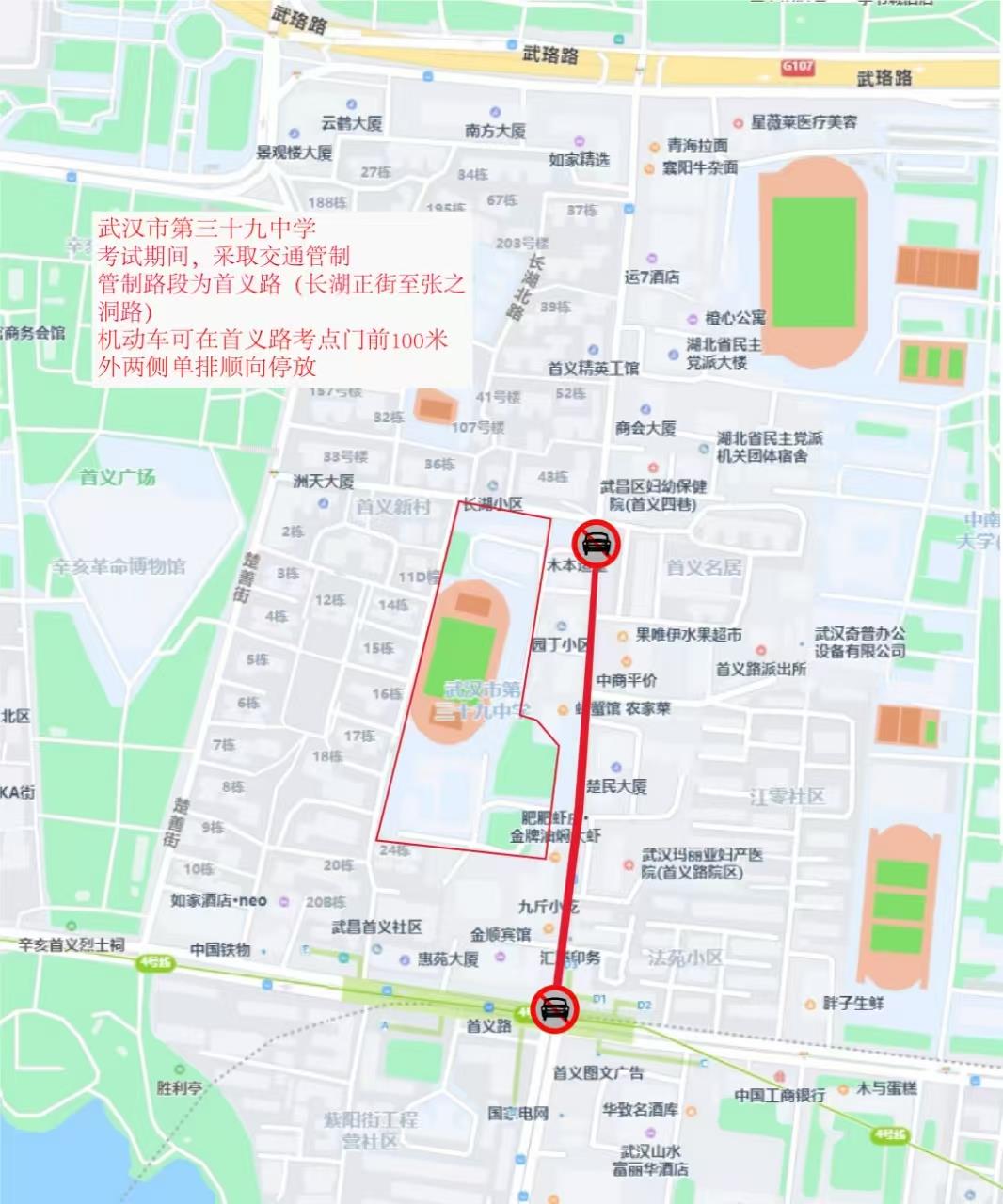 于首义路116号处,坐落着武汉市第三十九中学,在考试期间,首义路长湖正街至张之洞路的路段会实施管制,送考车辆得以在考点门前100米外两侧进行单排顺向停放,并且要服从现场交警的指挥,乘坐地铁4号线后在首义路站D3出口下车,经过步行约280米便可轻松抵达考点。