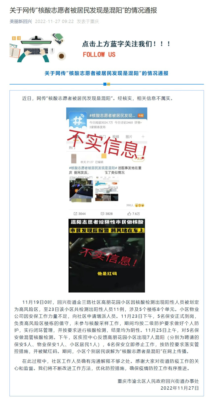 一则传言,是关于核酸志愿者是混阳的,曾在网络上扩散,在重庆渝北区,引发了当地居民的担忧。回兴街道办事处及时发布了核查通报,通过官方渠道,明确指出该信息完全不属实,有效地平息了不实信息带来的负面影响。
