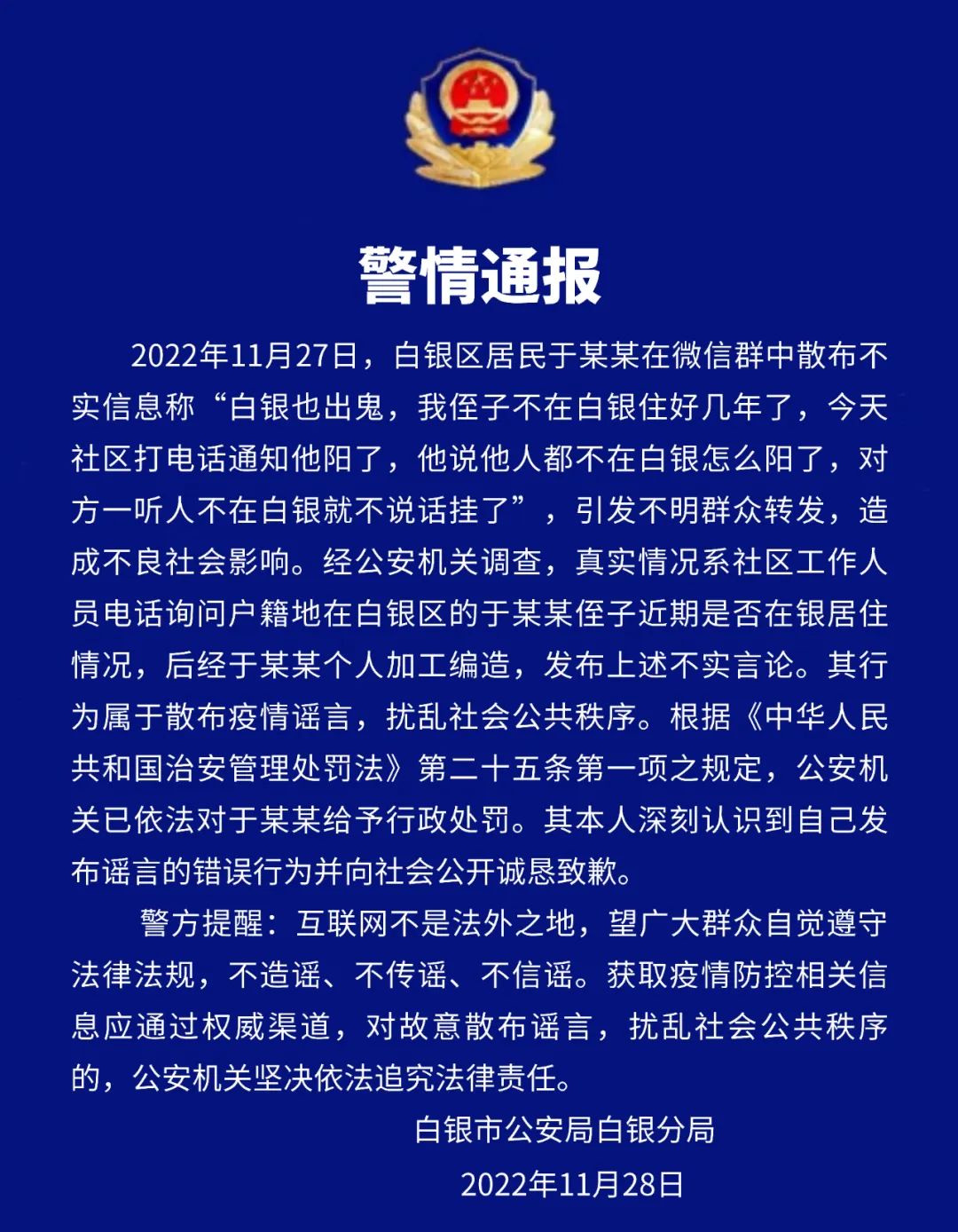 居住在甘肃白银的居民于某某,有着这样一段经历,这经历堪称一个典型的教训。存在这样一个情况,社区工作人员对居住情况进行常规询问,然而于某某却恶意地对其进行加工处理,把它变成了一个极为离奇的故事,即“人不在当地却被通知阳性”。随后,他还在微信群里面散布了这个虚假信息。这条虚假信息很快就传播开来,进而造成了不良的、负面的社会影响。