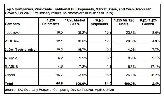 几家行业巨头在市场份额的表现分化,是本季度最直观的信号。两家机构数据都显示,市场份额前五分别是联想、惠普、戴尔、苹果和华硕。其中联想以超1650万台的出货量和超25%的市场份额领跑,出货量同比增长超8%。惠普则成为前五大厂商中唯一出货量下滑的企业,出货量同比下降4.9%,市场份额从20%滑落至18.5%左右。苹果凭借新款MacBook Pro、MacBook Air以及低价机型MacBook Neo的表现,市场份额突破10%。华硕则以超10%的同比增速成为前五大厂商中增长最快的品牌。