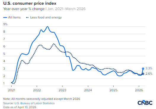 美国劳工统计局周五公布的数据显示,受伊朗战争引发能源成本飙升、美联储进一步远离通胀目标影响,3 月份消费者价格大幅上涨。不过,核心通胀相对温和。