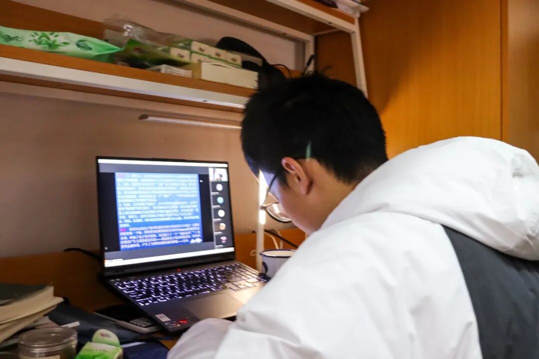 固定的通话时间是晚上6点半,属于603寝室,四台手机同时亮屏,屏幕那头爸妈们在学做刘畊宏操。隔离期间,该寝室家庭视频总时长累计超越800分钟,比过去一学期还要多。有家长寄来处于分好的状态且数量为28包的中药,还附带着写有“每天一包,分给室友一起预防胃病”字样的纸条。