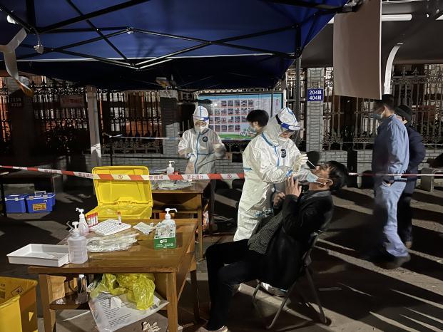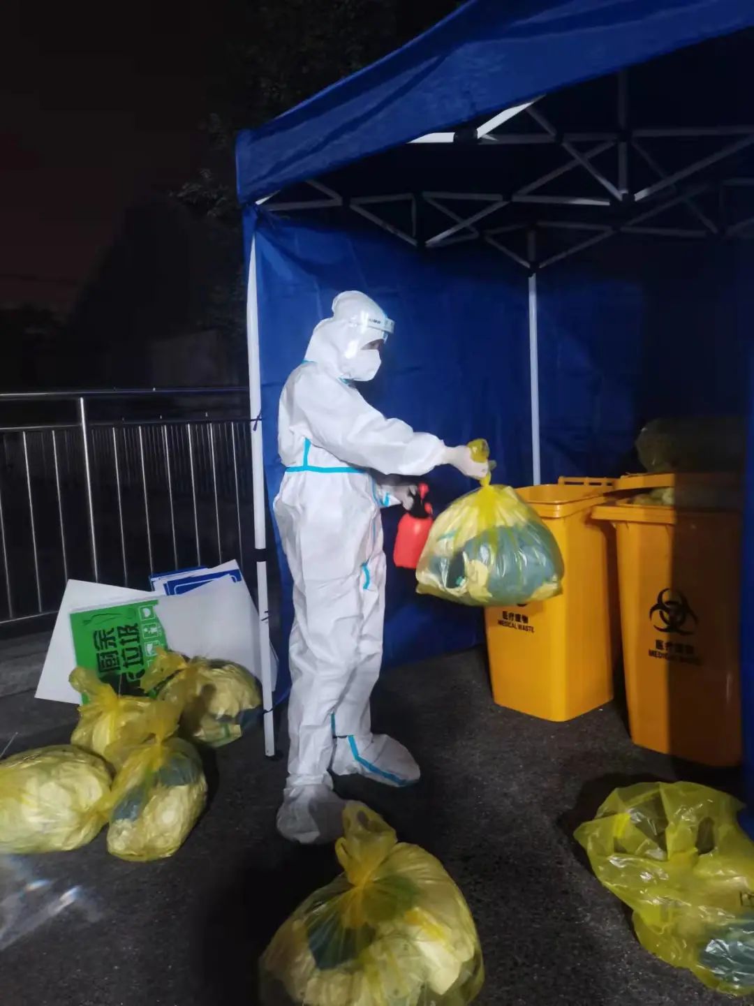 晚上十点的时候,区龙赛医疗集团龙赛院区的副院长柳辉高,才刚刚完成在石化三建社区的工作。他身为采样点负责人,要负责场地的布置。还要负责信息的录入。也要负责采样消杀工作。甚至医护人员吃饭这件事,都得由他来进行协调。从早上一直到晚上,大大小小所有事情,他都要操心。