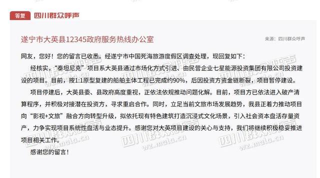 è¿æ¥ï¼å¨åå·çç½ç»é®æ¿å¹³å°âåå·ç¾¤ä¼å¼å£°âä¸ï¼æå¸æ°åæ 该项ç®çå°¾å¤å¹´ï¼æ¯å¦è½ç»§ç»å»ºè®¾ï¼å®æ¹åå¤ï¼ç»éå®å¸ä¸å½æ»æµ·æ 游度ååºç®¡çå§åä¼è°æ¥å¤çï¼é¡¹ç®æ¹å·²ä¾æ³è¿å ¥ç ´äº§æ¸ ç®ç¨åºï¼å¹¶ç§¯æå¯¹æ¥æ½å¨æèµæ¹ï¼å¯»æ±éå¯åä½ï¼å度å¼èµ·å ¬ä¼å ³æ³¨ã