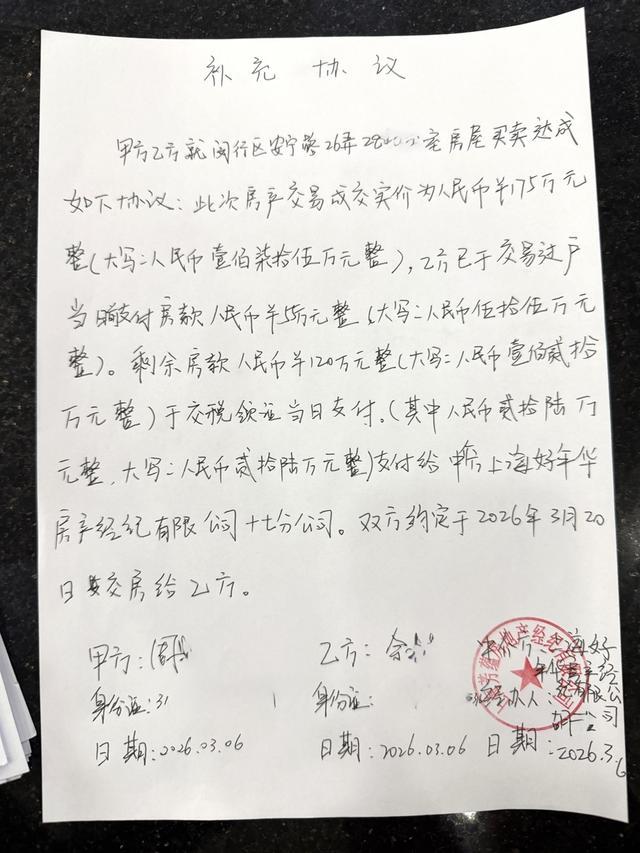 å¨å®æé¦ç¬æ¿æ¬¾è½¬è´¦åï¼ä¸ä»è¿è¦æ±åä¿å¥³å£«ãä½å çç¾è®¢ä¸ä»½âè¡¥å åè®®âï¼æç¡®ä½å ç卿¯ä»å°¾æ¬¾æ¶éè¦å°å ¶ä¸ç26ä¸å åç¬è½¬ç»ä¸ä»æ¹ï¼è䏿¯ç»ä¹°æ¹ã