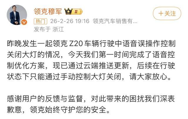 2月26日晚间,领克汽车销售有限公司副总经理穆军在其认证微博上公开回应:“昨晚发生一起领克Z20车辆行驶中语音误操作控制关闭大灯的情况,今天我们第一时间完成了语音控制优化方案,现已通过云端推送更新,后续在行驶状态下只能通过手动控制大灯关闭。”