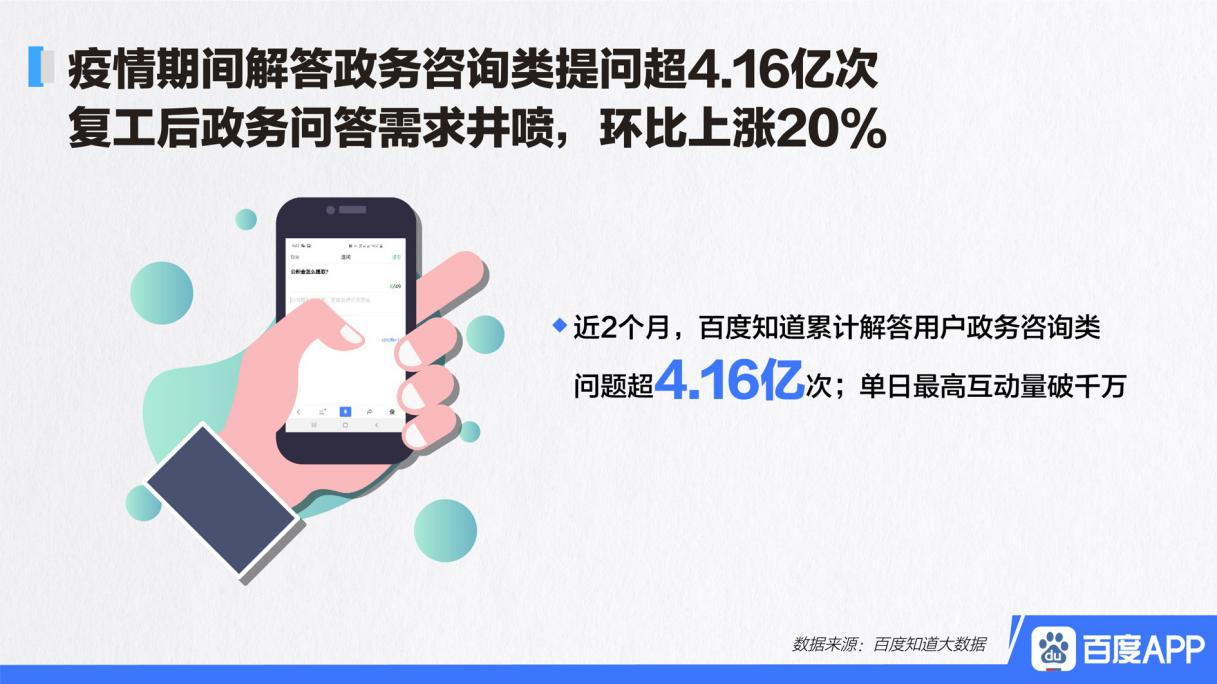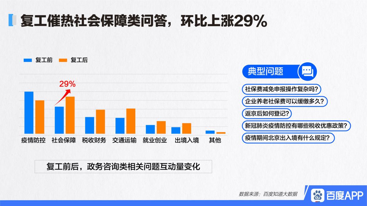 复工令一经发出,人口流入较多的大省份立刻就成为了提问极为集中的重点区域,北京、广东、江苏等地的百度知道用户疯狂地进行刷屏,他们纷纷提出,返京是否需要接受隔离,进入广东需要办理什么手续,社保减免该如何进行申报,4.16亿次的政务咨询,单日之中最高突破了千万次,这哪里是什么问答的平台呀,简直完完全全就是在线上的 “信访办” 啊!
