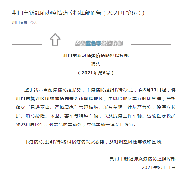 湖北荆门市疫情防控指挥部做出的最新决定是,从8月11日开始,把掇刀区团林铺镇划定成中风险地区,这个区域施行严格的封闭管理,要落实“只进不出、严格居家”的管控举措。