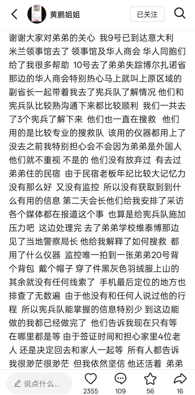 2月15日,黄鹏的姐姐发文称,她于2月9日抵达意大利,10日去了弟弟失踪的地方——意大利博尔扎诺省,并了解到当地宪兵一直在持续搜寻黄鹏,她还去了弟弟的学校并和当地警察局长见了面。警方给黄鹏姐姐提供了一段她弟弟1月20号背个背包、戴个帽子、穿了件黑灰色羽绒服上山的画面,这也是黄鹏失联前监控拍到的唯一画面。“弟弟失联手机最后定位的地方,宪兵队也排查了无数遍,由于弟弟没有和任何人说过他的行程,所以宪兵队能掌握的信息特别少。他们告诉我现在只有回家等消息,由于签证快要到期并且家里还有四位老人,我还是决定回去和家人一起等,所有人都告诉我希望很渺茫,但我依然坚信弟弟还活着,我坚信奇迹会在他身上发生。”黄鹏的姐姐称。