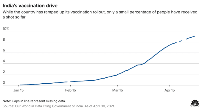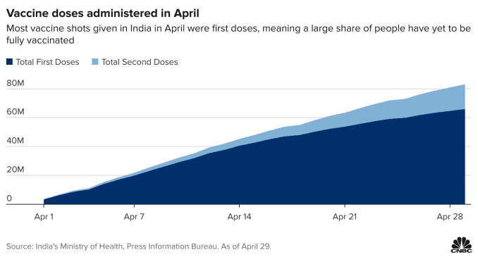 印度于今年一月开启大规模疫苗接种,然而其推进速度远远未达控制疫情所需的水平,截至四月底,印度全国总共接种了大约一亿五千四百万剂疫苗,这表明全国仅仅只有约十分之一的人口接种过至少一剂的疫苗。