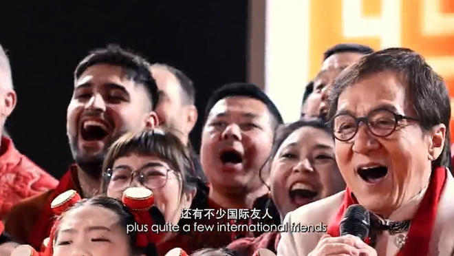 今年春晚,成龙出现在义乌分会场,身边都是小朋友,还有不少国际友人