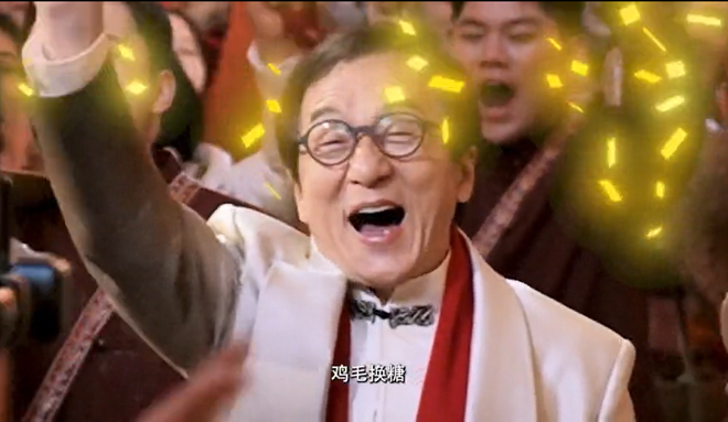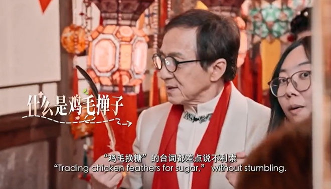 开场时,一根轻盈的羽毛飘落在成龙手上,伴随他一声悠长的“鸡毛换糖喽”,这项承载城市集体记忆的传统交易方式瞬间被唤醒。