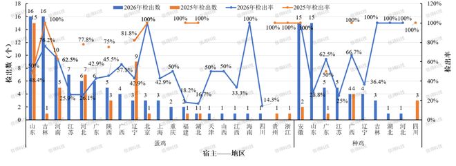 MG的检出率为29.4%,跟去年同期相比显著上升了10.5个百分点,其流行强度明显加大。ILTV的检出率是36.3%,与上一阶段相比增加了9.1%,aMPV - B的检出率为19.7%,和去年同期相较增加了9.5%。这组数据清楚地显示出,在冬季寒冷的环境当中呼吸道病原正在加快传播速度。