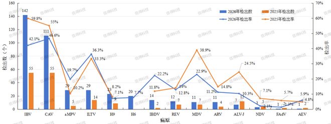 IBDV的检出率,和同比相比增加了10.4%,和环比相比也展现出上升的态势,nVarIBDV的流行株已然占据了主导地位。免疫抑制病原会破坏鸡群的免疫系统,进而致使疫苗应答能力出现下降,这乃是很多鸡场所进行的多次免疫之后依旧会发病的根本缘由。在CAV呈阳性的场域,必须要把其他垂直传播病原的净化置于优先地位。