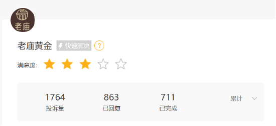 在黑猫投诉 上,老庙黄金的累计投诉量为1764件,其中不少也涉及一口价换购的问题,不少消费者质疑老庙黄金涉嫌隐瞒克重、诱导消费。