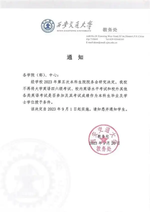 西安交大教务处的工作人员明确地讲了,这乃是学校依据当下的发展形势所做出的正常的举措,并且早在10多年以前就已经有高校开始推行类似的做法了。2023年9月1日开始实施的新规,这表明本科生不用再因为四六级没有过而拿不到学位证而发愁了。
