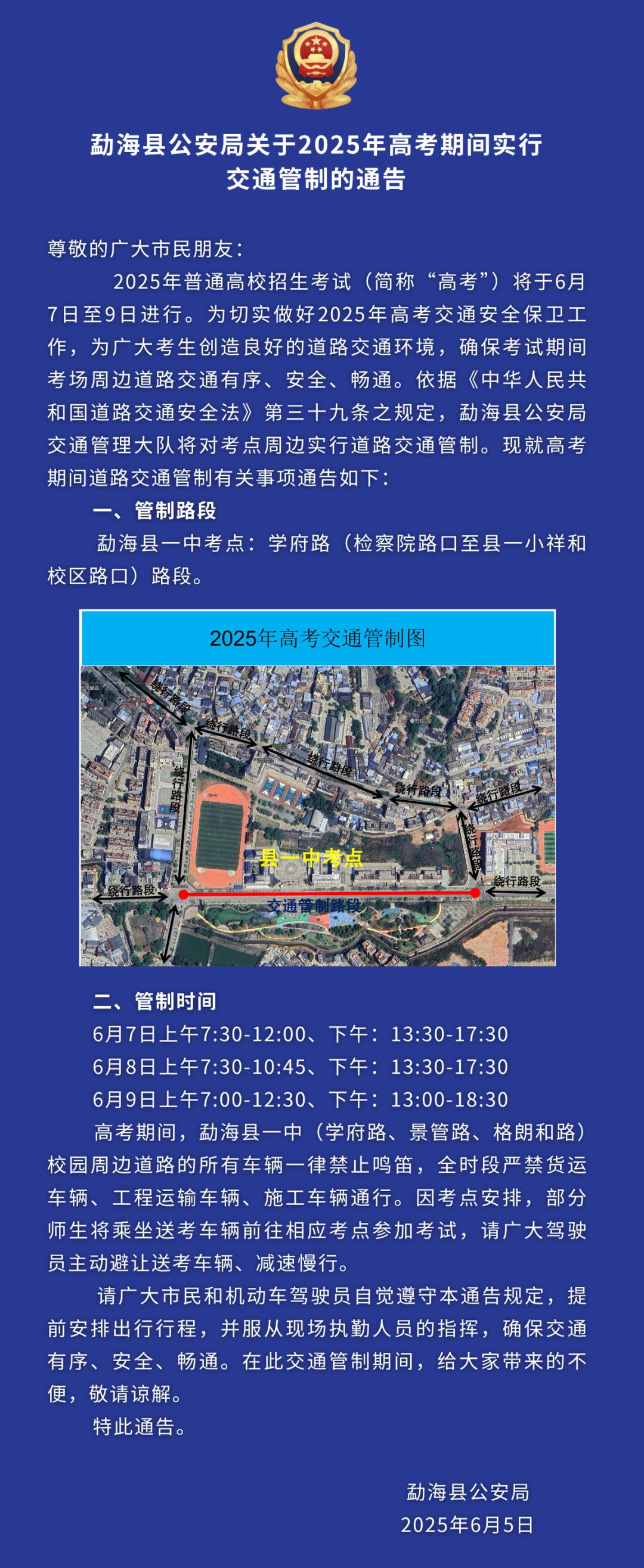 即使通告大多关乎景洪以及勐腊,然而勐海县的考生及其家长同样不可疏忽大意。依照以往的惯例,勐海县公安局也会在最近发出相同的管制通告,考点一般设置在勐海县第一中学。家长们应当紧密留意当地交警部门的官方消息,预先知晓勐海考点周边的管制路段还有时间,防止考试当日走错道路或者被堵在路途上。