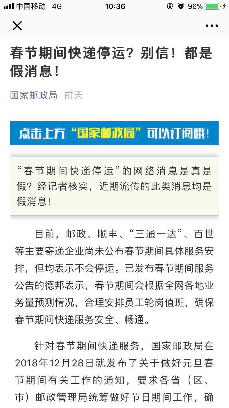 春节之前,总是能够看到有各种各样的“快递停运时间表”,在微信群以及朋友圈之中进行刷屏,今年的情况也并非例外。有好多人看着这些相关消息,一方面忧虑网购回来的年货没办法收到,另一方面又害怕着急需要寄出的文件发不出去。国家邮政局已经通过官方渠道进行辟谣,明确地告知你:不要相信这个,快递在春节的时候是不会停止营业的。